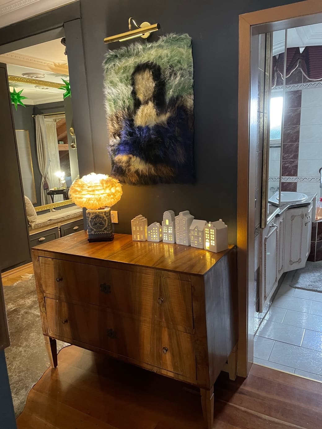 Jeg elsker dette veldig særegne veggteppet med lodden Mona Lisa! Jeg så det hjemme hos noen og måtte bare ha det! Det er veldig, veldig kult!