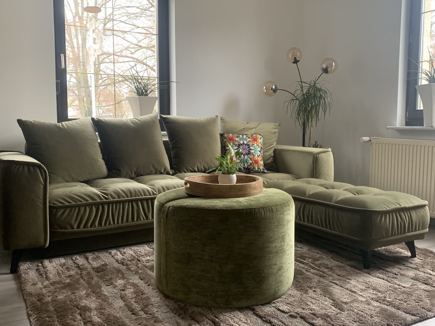 Hallo, Jeg bestilte denne vakre sofaen for noen uker siden. Bildet på nettet gjenspeiler nøyaktig dens faktiske utseende. Det mosegrønne fløyelsstoffet ser veldig elegant ut, og de store putene gir en viss letthet, noe som gjør at stuen føles koselig og moderne. Jeg bruker bagasjevognen som et bord eller en krakk, og det skaper ekstra hygge.