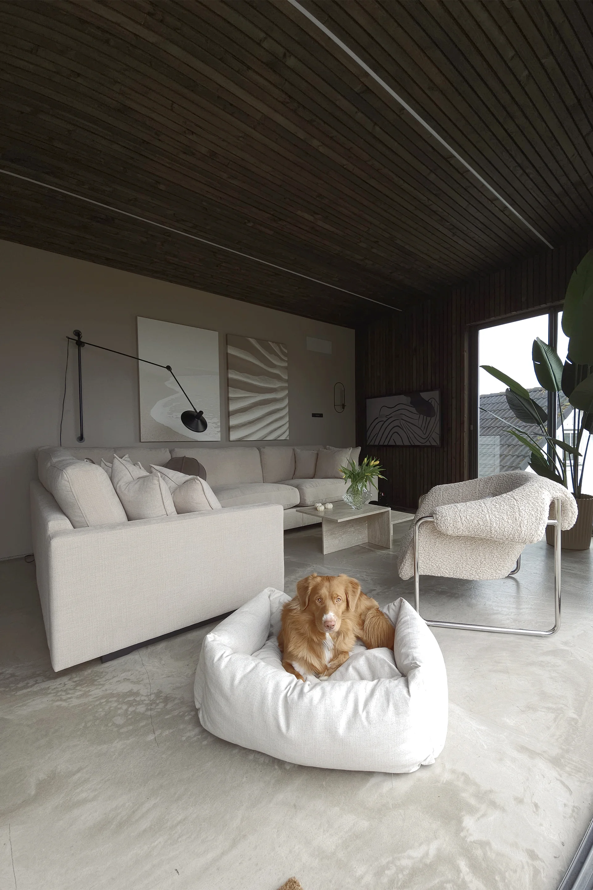 Et trygt og tilbaketrukket hvilested med en stilren følelse som helt enkelt går godt sammen med øvrig innredning. Fyllet er laget av myk silikonfiber som til stor glede for eier er vaskbart. Livet som hund ble akkurat nå enda bedre.