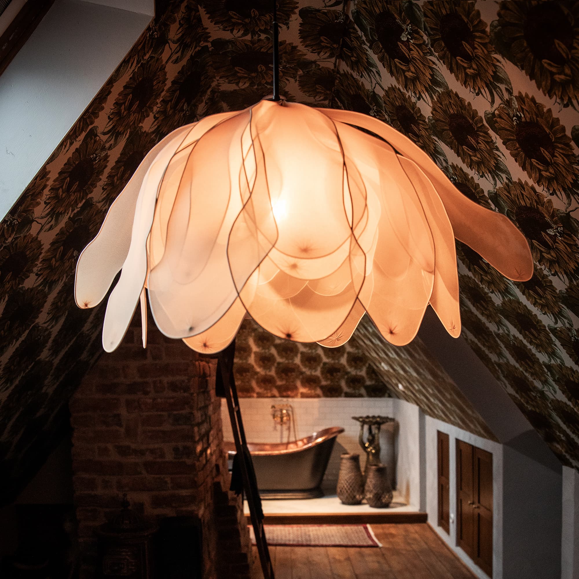 Oppdag Lou Lou-taklampen - et herlig kunstverk! Skapt av Lisa Bengtsson for By Rydéns, den har fem bøybare stoffblader i ulike nyanser for å forme etter ditt ønske. Med imponerende 80 cm i diameter og 59 cm i høyde, sprer den en magnifik glede i rommet ditt. Lou Lou er ikke bare en lampe; den er et kunstverk og en interiørdetalj som skaper en unik og herlig atmosfære i hjemmet ditt!