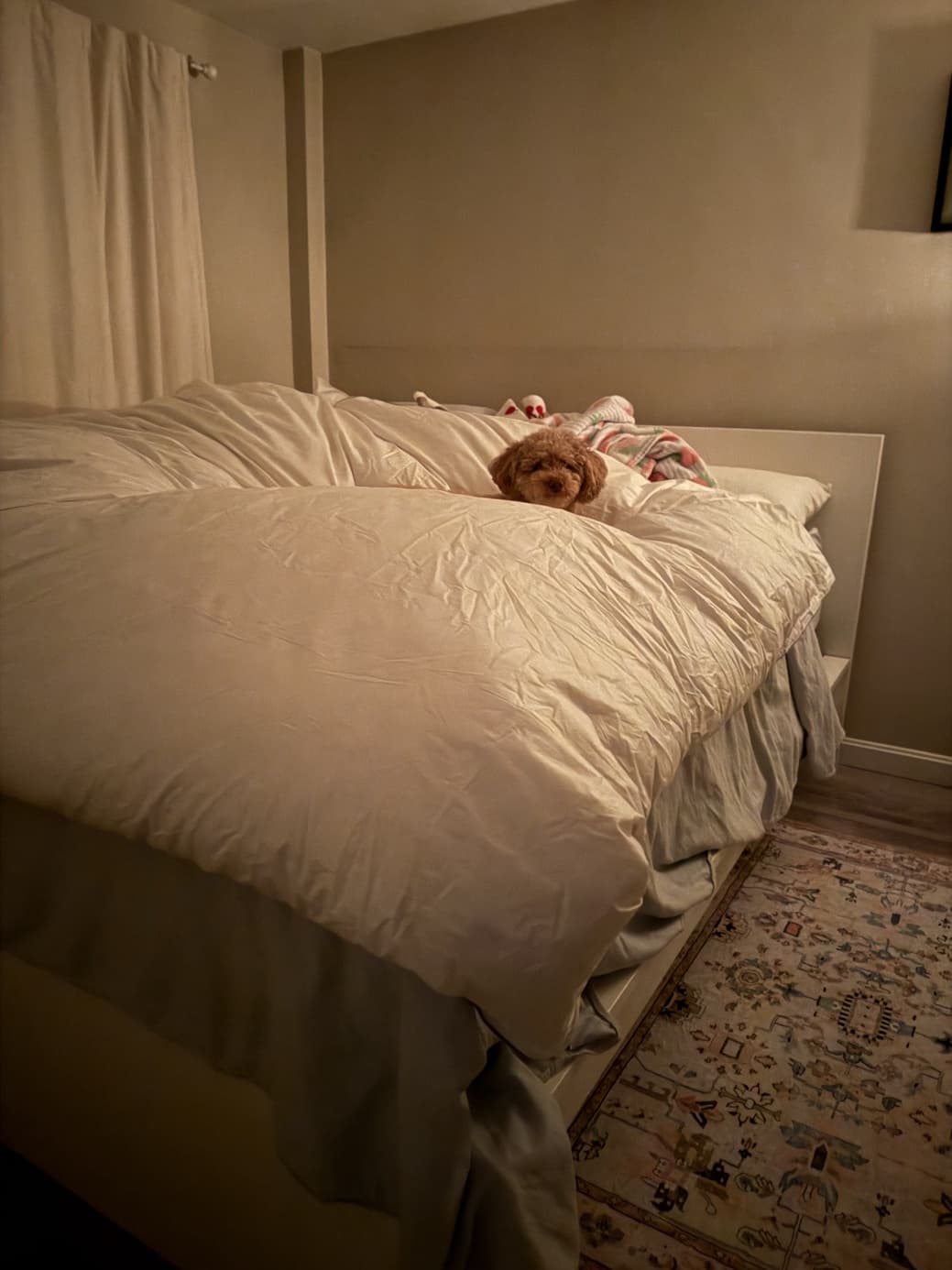 Hi Brenda! Thank you so much for your lovely review! 🐾😻 Your dog looks absolutely adorable, so cute on the duvet! 💕 As for the fluff, gently move the down with your hands or arms to distribute the filling evenly throughout the duvet. It might take a little time to get used to. Also, please note that down and feathers typically take a few days to fully expand after being unpacked. We hope that you will love it as much as your dog do!💕 Best wishes, Nils ☁️