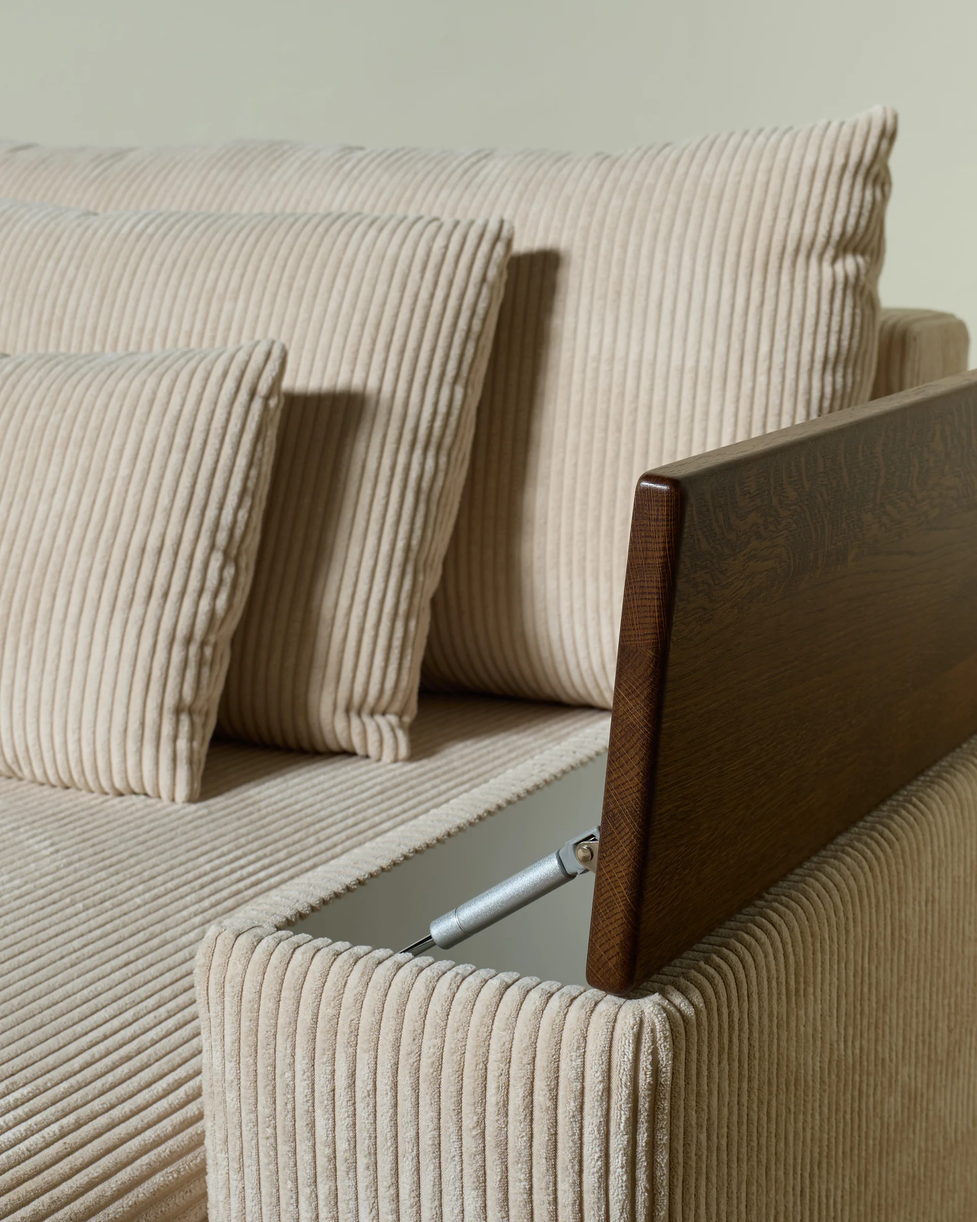 Det er mulig å velge mellom to forskjellige armlener: et polstret armlene, eller et armlene med trelokk og oppbevaringsmulighet. Du kan også kombinere ett av hver. Armlenene er vendbare og kan derfor monteres på begge sider. Hvis du senere ønsker å bytte plass på armlenet skrur du det løs og bytter plass.