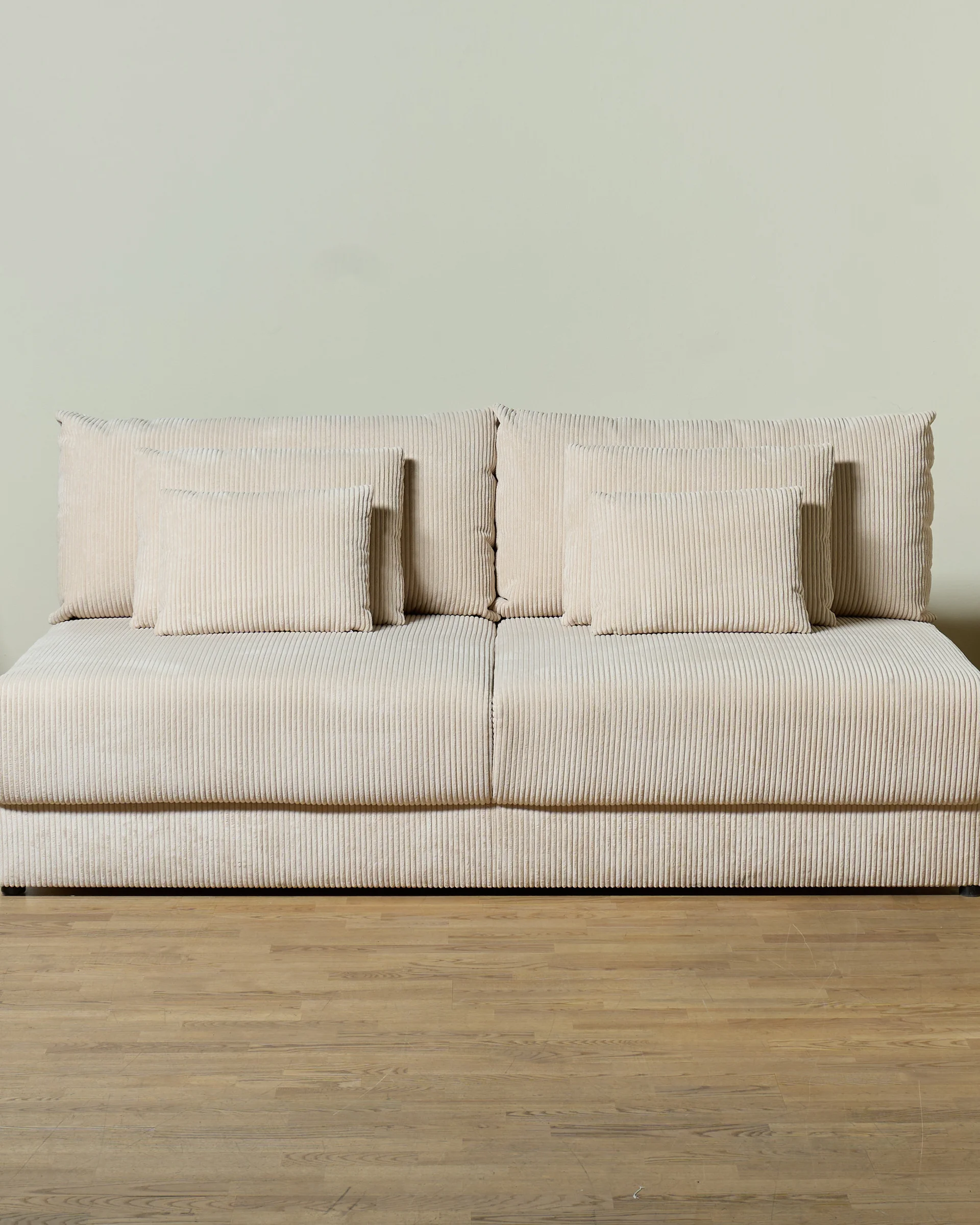 Sofaen krever armlener som avslutning. Uten dekselsider/armlener er oppbevaringsboksen eksponert, men det påvirker ikke sofaens funksjon. Et alternativ til armlenene er de smale dekksidene.