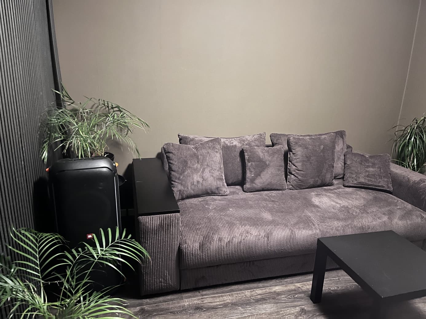 Dyp sovesofa i myk, bredstripet kordfløyel, stilig fløyel eller slitesterkt bouclé-stoff.