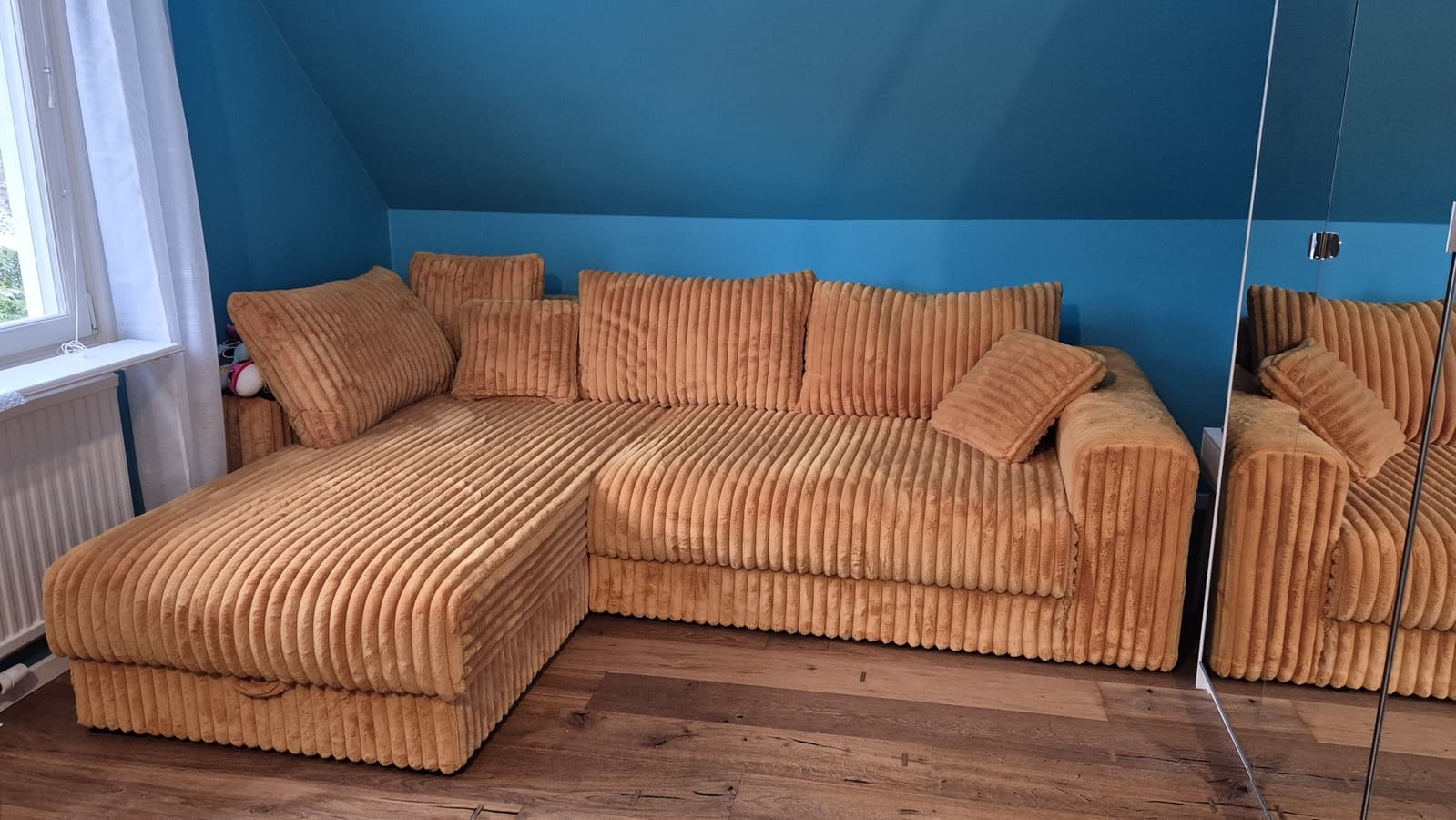 Stilig og veldig komfortabel sovesofa! Kordfløyelsstoffet er både deilig og mykt.