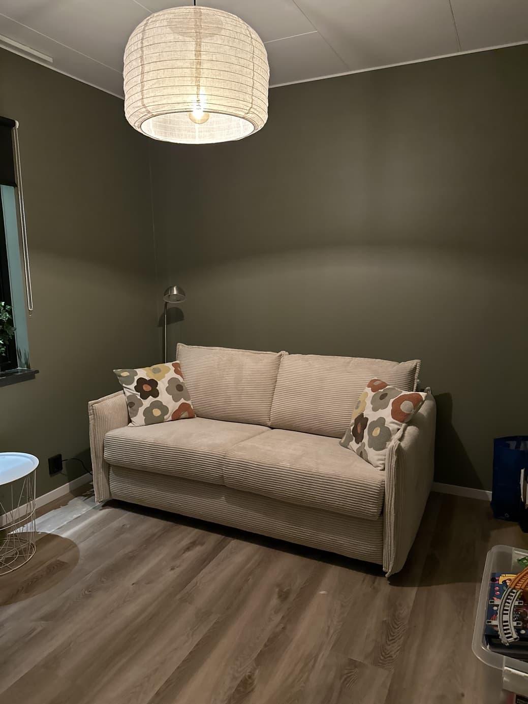 Superfornøyd med sofaen min, stoffet passet perfekt til det grønne rommet mitt. Ganske enkel å montere, måtte løsne beslagene litt siden de ikke passet 100 %. Akkurat riktig størrelse for rommet mitt på 9–10 kvm. Vil være bra som en ekstra seng for barnebarn eller gjester.