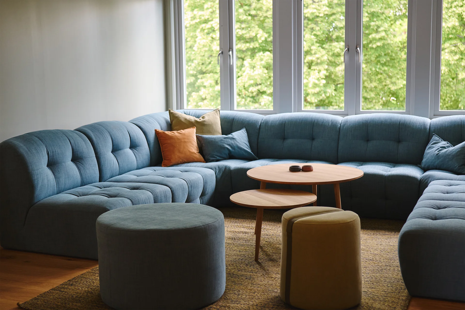En stor og stabil puff som fungerer som både ekstra sitteplass og fotstøtte/sofa