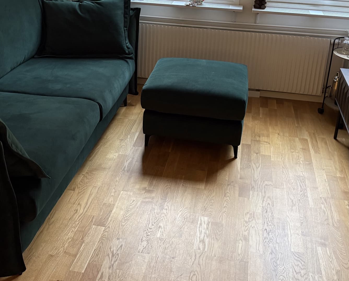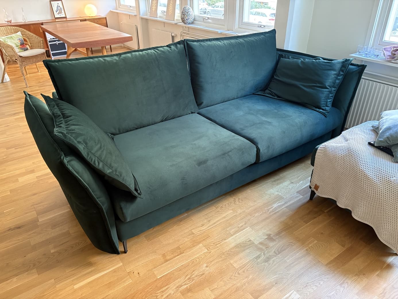 Smaragdgrønn Katten Rak og Katten fotskammel Husk at sofaen er fast. Jeg ser at noen har klaget på dette. Jeg anbefaler å dra til utstillingslokalet i Stockholm og kjenne og klemme, slik at du vet hva du vil ha! Jeg synes stoffet er veldig fint og føles luksuriøst! Du trenger ikke å re opp sengen helt for én person/én natt, men den er bred som den er hvis du fjerner putene. Re opp den hvis 2 personer skal dele seng.
