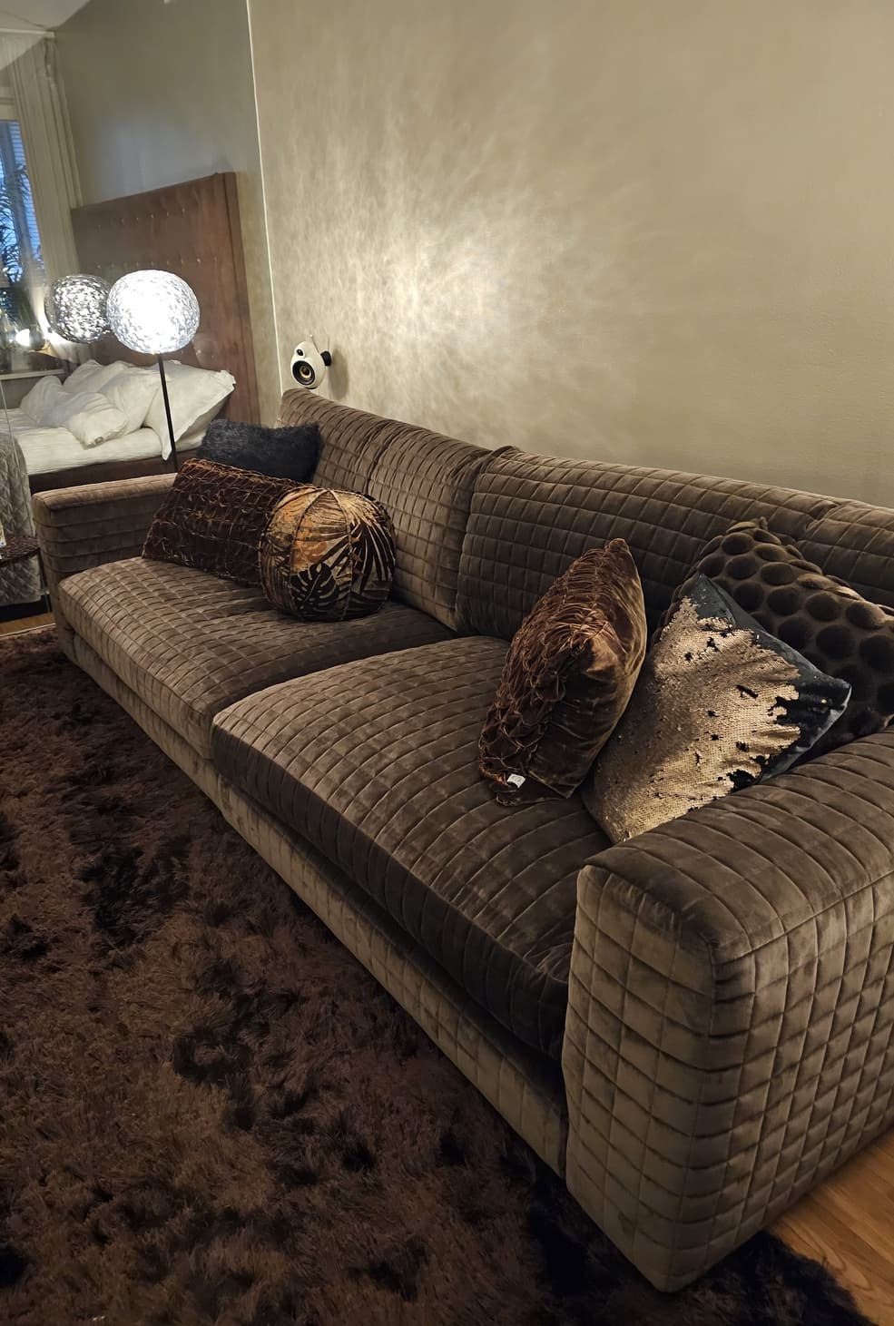 Fantastisk komfortabel sofa, valgte mørkegrønn fløyel som er behagelig å sitte i og gir en fin glans. Kjøpte også puter i en annen farge og stoff som passer fint sammen. Så fornøyd!