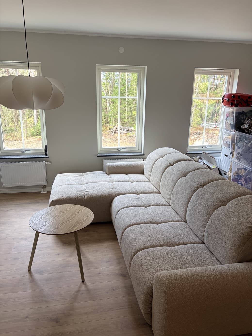 Jeg var livredd for at vi ikke skulle få opp sofaen i øvre etasje. Jeg hadde flere samtaler med kundeservice og fikk god hjelp av Majken! Heldigvis var det ene armlenet enkelt å ta av, og med litt innsats og styrke var det fortsatt mulig. Det står at pakken skal være 90 cm, men den er bare rundt 84 cm, noe som var gode nyheter. Jeg var nær ved å avbestille den flere ganger i løpet av leveringstiden 🙈 Vi er så fornøyde! Som mange skriver, er den ganske vanskelig, men jeg håper den vil mykne opp over tid. Et veldig kult møbel som pynter opp hele rommet. Vi er så glade for Valross-en vår 😍
