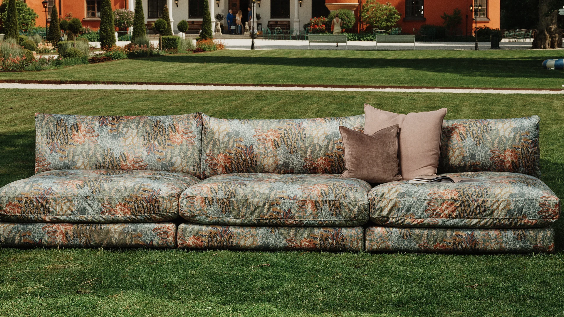 Inviter naturen inn med et tekstilhåndverk i særklasse. Et vakkert eng- og blomstermønster i jacquardvev som fanger nysgjerrige blikk. Det blomstrete stoffet er laget av myk og slitesterk polyesterfløyel med kort lugg, av eksklusiv italiensk kvalitet.