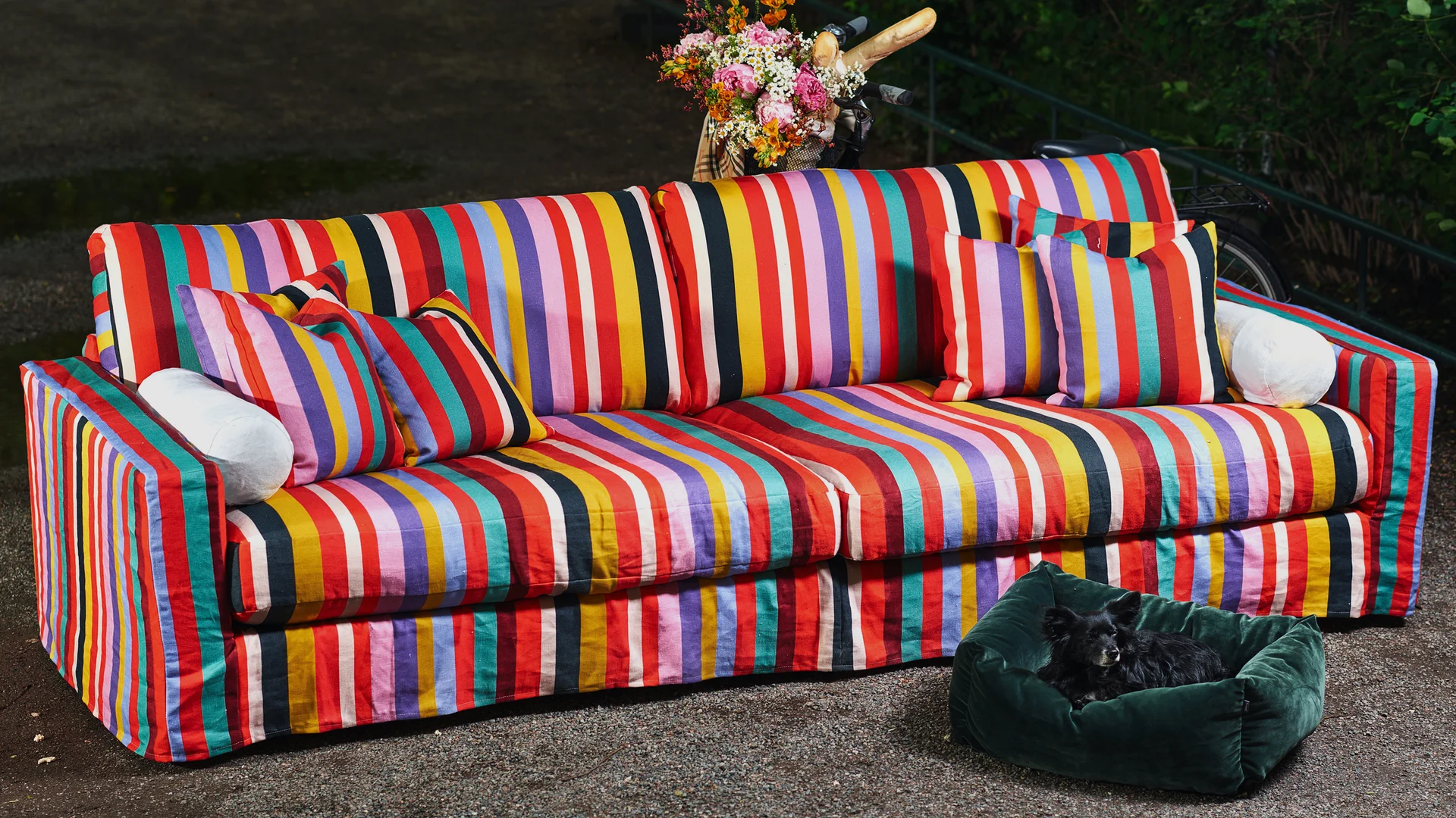En one-of-a-kind kreasjon designet kun for Sweef og vår kjærlighet til alle regnbuens farger, lekenhet og å være generelt litt gal. Sweef stripe er en perfekt hyllest til disse egenskapene og passer deg som vil ta ut svingene ordentlig. Et stoff i 100% lin trykket med vårt helt eget print. Sweef stripe finnes i to versjoner: 01 Strong som byr på maksimal fargestyrke og 02 Soft som gir en svakere og mer dempet følelse. Hvilken av de flytter hjem til deg? Stoffets striper går loddrett over sofaen.